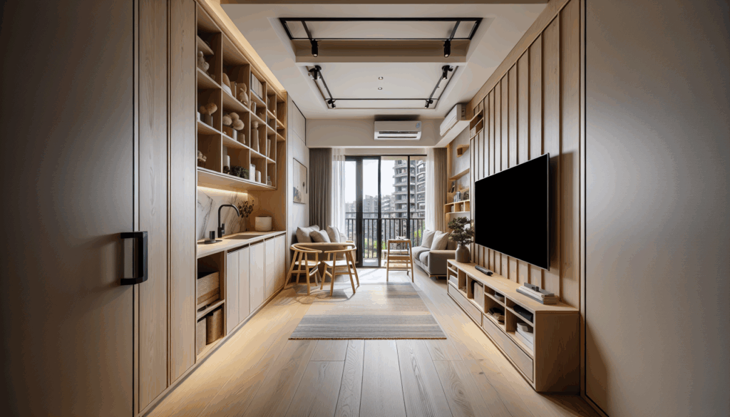 - 整合收納櫃體:將電視櫃與儲物櫃、展示櫃無縫結合,利用垂直空間創造大量收納,減少額外家具佔用地面面積。