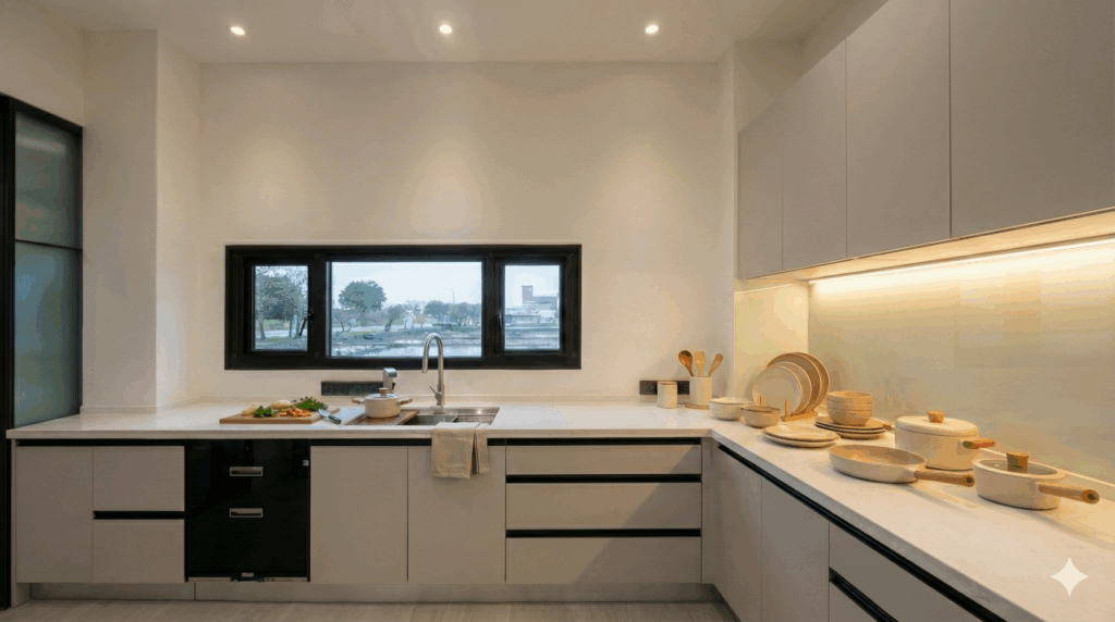 - 簡約線條美學: 家具與櫥櫃設計多採簡潔的直線條,避免繁複的雕飾,展現俐落大方,同時減少清潔負擔。